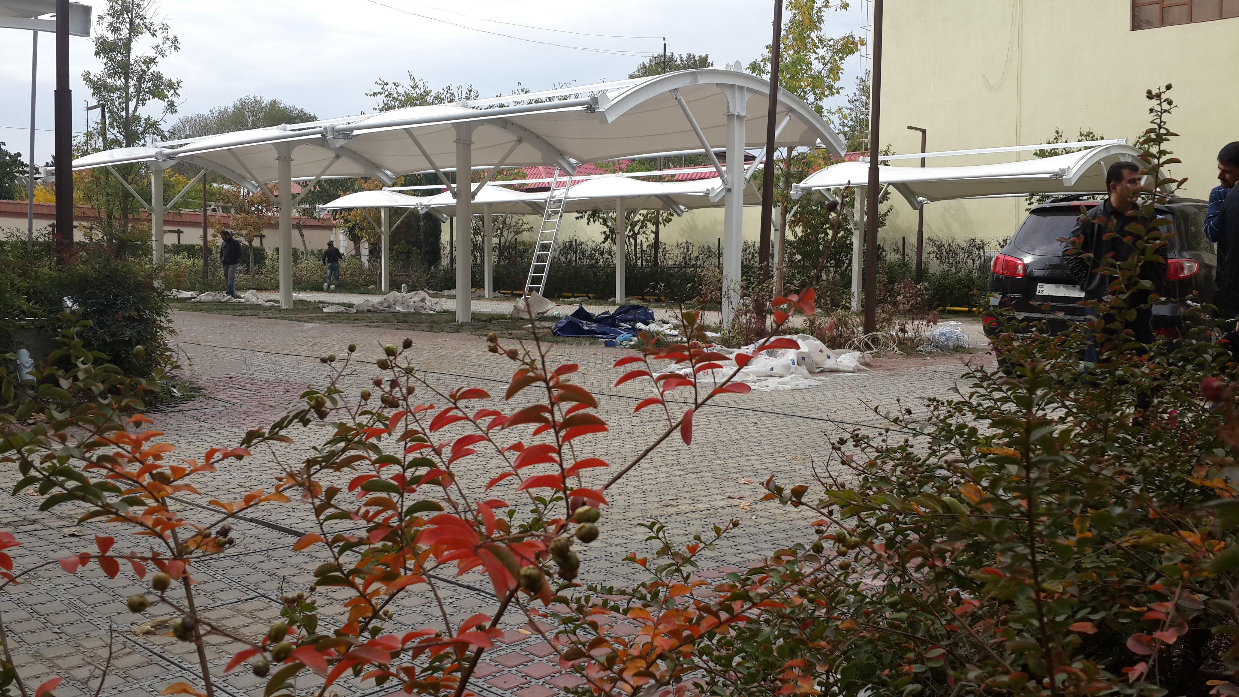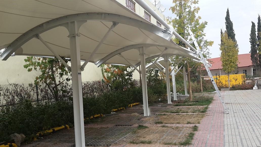Мембранный навес эффективно защищает автомобили от солнечных лучей, дождя и снега.