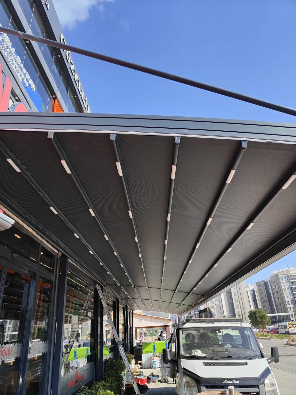 Alüminyum taşıyıcı profiller, UV dayanımlı membran/tente kumaşı ve opsiyonel LED aydınlatma ile uzun ömürlü bir üst örtü sistemidir.